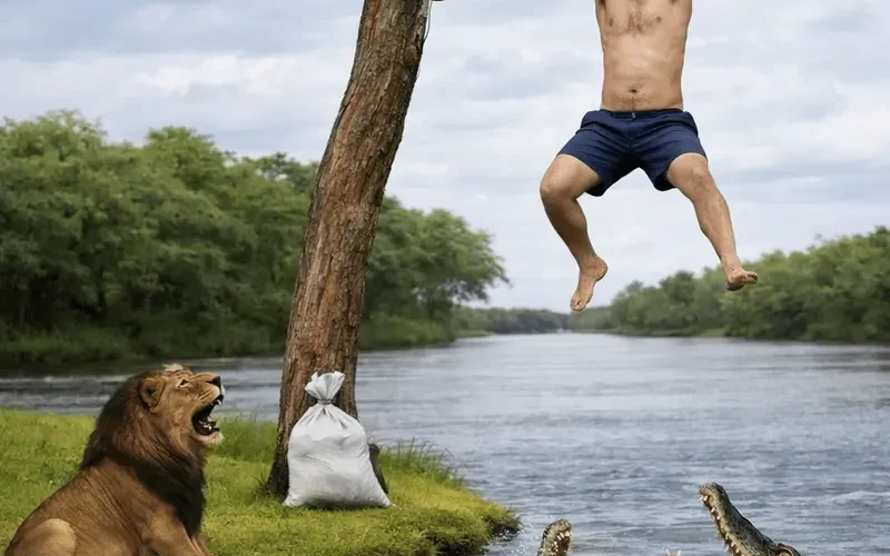 This is a viral brain teaser with no simple answer. A man is facing danger from a lion, snake and a crocodile. Hanging from the tree, wearing only an half pant. How can he save himself? Any solution for his problme?